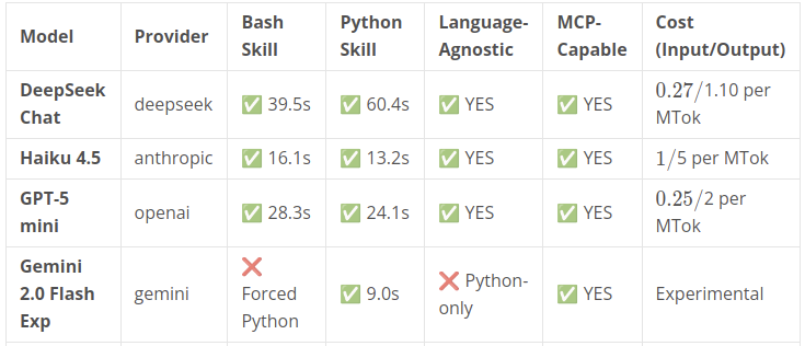 - Python-biased models (Gemini, Kimi) forced Python even when bash skills were specified